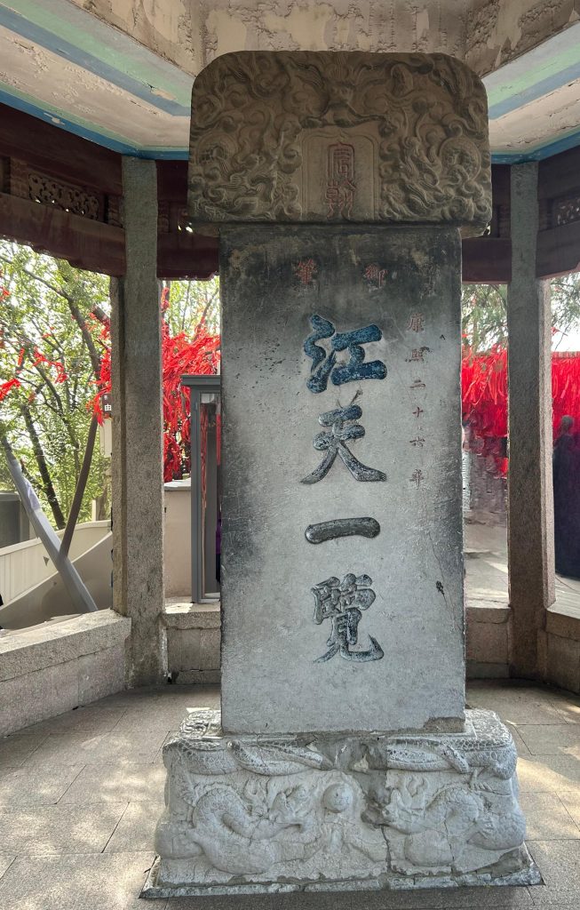 绕到寺庙的后山,登到高处可见一亭,里面有个石碑,上面刻着“江天一览”。据说是康熙登临此处,见视野开阔、可览江天一色即兴题字而得。不过可能因沧海桑田的变迁或是天气不好,我到这里似乎并未看到大江东去、水天一色的壮景,事后竟忘记此处。经S兄评论区提醒才记得,修改补记。
