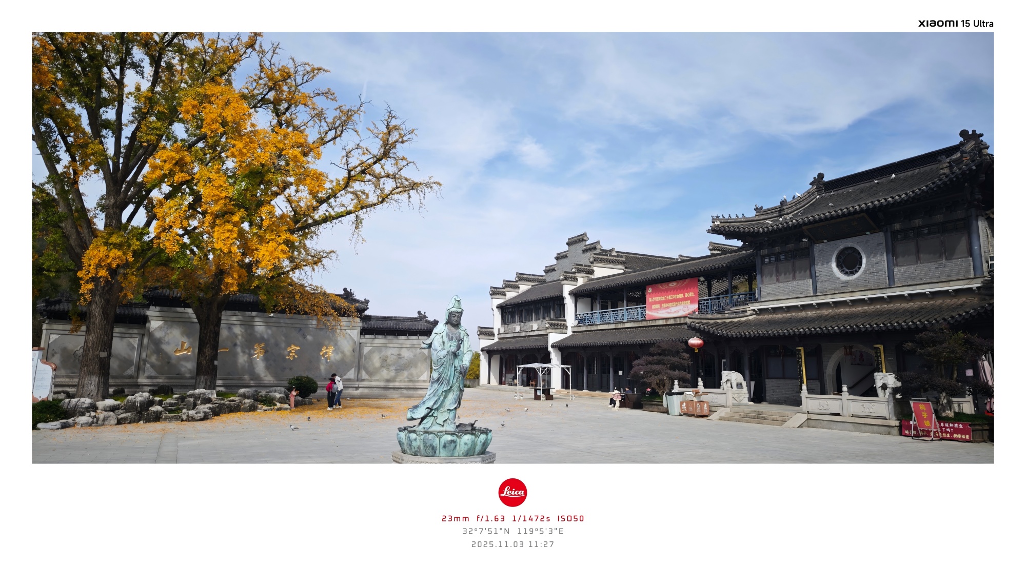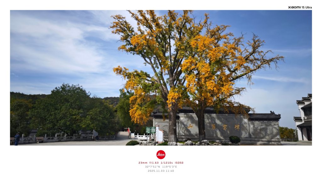 未有多久,我们就到了隆昌寺。寺前广场上矗立着一颗银杏树,叶子已染满金黄,地上也铺满一层秋色,但仍显现出枝繁叶茂的状态,让人备觉热烈,完全没有秋天萧瑟凄凉的氛围。
